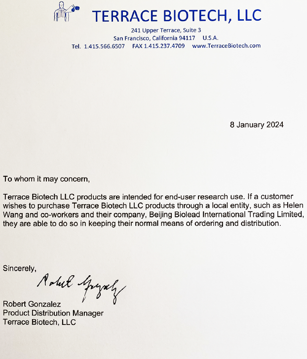 作為T(mén)errace Biotech在中國(guó)區(qū)總代理,北京博蕾德生物科技有限公司為中國(guó)客戶(hù)提供全面的Terrace Biotech產(chǎn)品和服務(wù)。下圖為T(mén)errace Biotech 授權(quán)北京博蕾德生物科技有限公司作為T(mén)errace Biotech在中國(guó)區(qū)域的代理授權(quán)書(shū)。