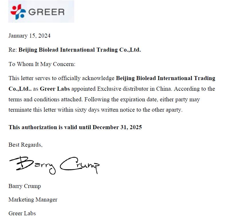 作為 Greer Labs 在中國區(qū)總代理,北京博蕾德生物科技有限公司為中國客戶提供全面的Greer Labs 產(chǎn)品和服務(wù)。下圖為Greer Labs 授權(quán)北京博蕾德生物科技有限公司作為Terrace Biotech在中國區(qū)域的代理授權(quán)書。
