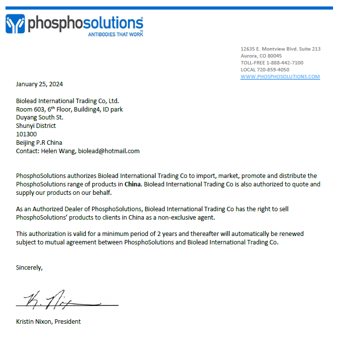 2)細(xì)胞周期和生長發(fā)育作為 PhosphoSolutions 在中國區(qū)總代理,北京博蕾德生物科技有限公司為中國客戶提供全面的PhosphoSolutions 產(chǎn)品和服務(wù)。下圖為PhosphoSolutions 授權(quán)北京博蕾德生物科技有限公司作為PhosphoSolutions在中國區(qū)域的代理授權(quán)書。