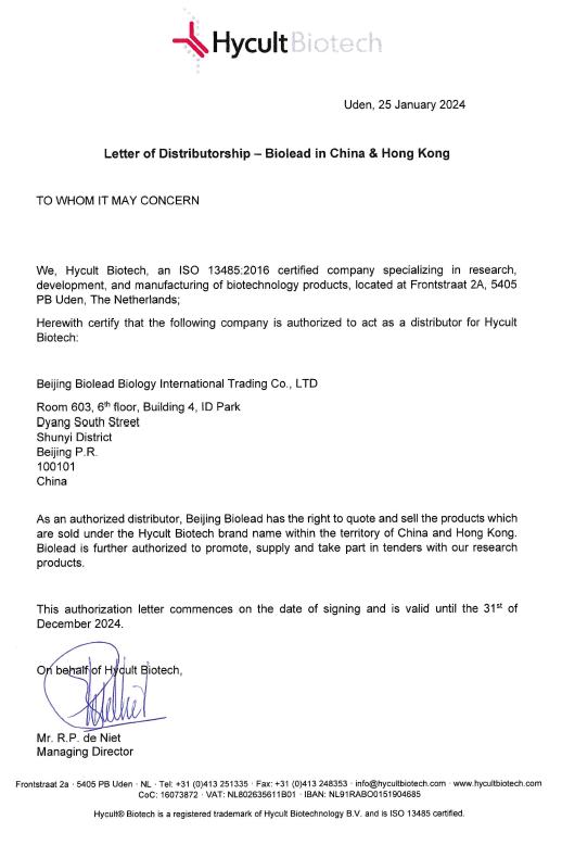 作為 Hycult 在中國區(qū)總代理,北京博蕾德生物科技有限公司為中國客戶提供全面的Hycult 產(chǎn)品和服務(wù)。下圖為Hycult授權(quán)北京博蕾德生物科技有限公司作為Hycult在中國區(qū)域的代理授權(quán)書。
