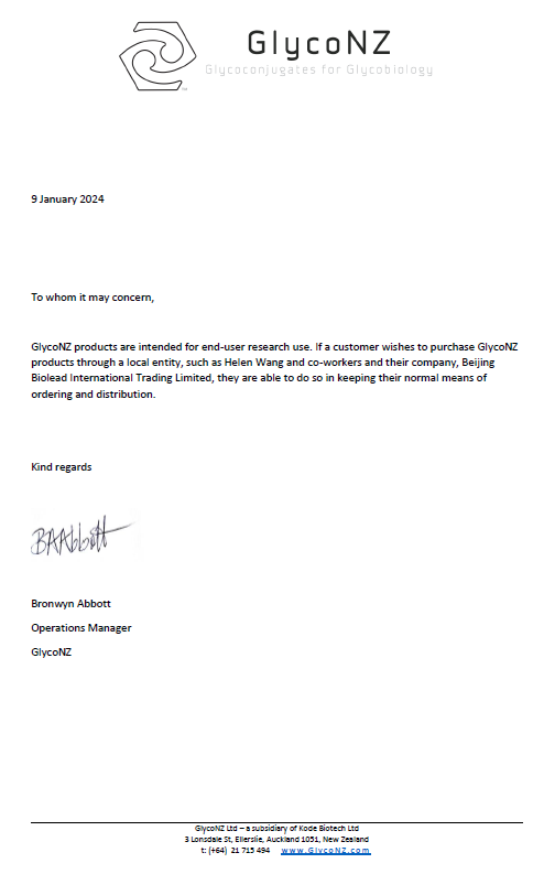作為 GroPep Bioreagents 在中國區(qū)總代理,北京博蕾德生物科技有限公司為中國客戶提供全面的GroPep Bioreagents 產(chǎn)品和服務。下圖為GroPep Bioreagents 授權(quán)北京博蕾德生物科技有限公司作為GroPep Bioreagents 在中國區(qū)域的代理授權(quán)書。
