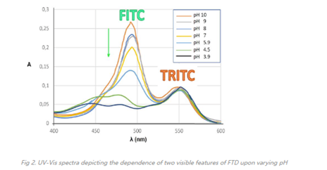 光譜數(shù)據(jù):FITC-TRITC葡聚糖為雙重熒光標記,當在λex=493 nm(FITC)下光激發(fā)時,F(xiàn)ITC-TRITC-葡聚糖在λfl=517±5nm處表現(xiàn)出熒光峰,而當在λex=550 nm(TRITC)下激發(fā)時,在λfl=575±5nm處顯示出熒光峰。FITC- TRITC葡聚糖雙重標記的特別之處在于,其中FITC熒光(以及吸光度)高度依賴于pH值,而另一個相應(yīng)的熒光TRIT在pH2 和10之間保持不變(見圖2.)這樣可以準確測定活細胞和組織中的pH值,