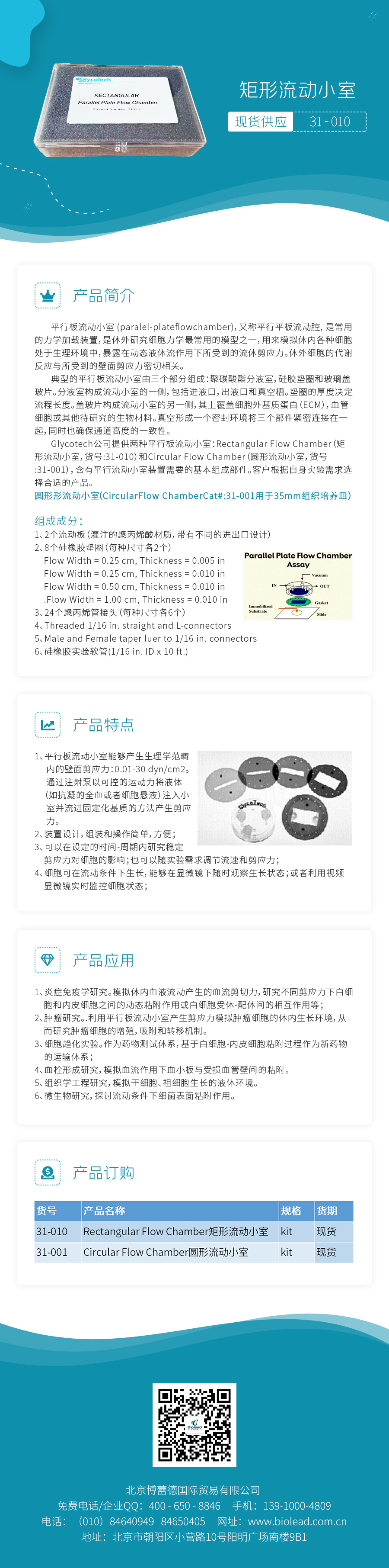 Glycotech公司提供兩種平行板流動小室:Rectangular Flow Chamber(矩形流動小室,貨號:31-010)和Circular Flow Chamber(圓形流動小室,貨號:31-001),含有平行流動小室裝置需要的基本組成部件??蛻舾鶕?jù)自身實驗需求選擇合適的產(chǎn)品。
