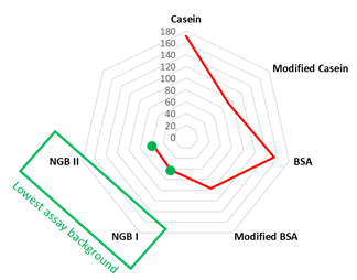 1. 1% BSA, 1% casein, 1% physical-chemical modified BSA, 1% physical-chemical modified casein in 1xPBS, NGB I and NGB II were tested using Lab Bio Anti-Atezolizumab (Human) antibodies MSD Kit