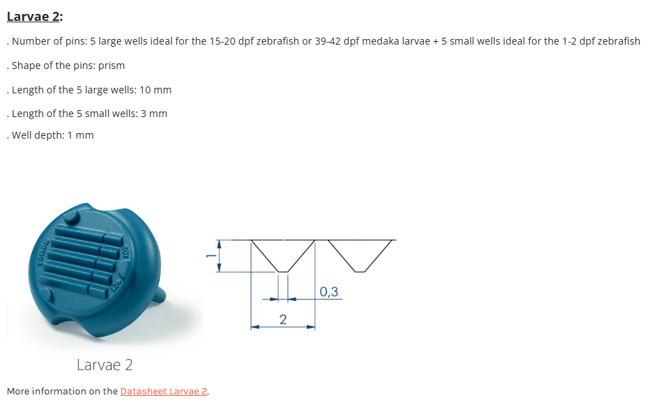 Stampwell stamps imprint arrays of wells in hydrogels in just one time. Nothing more to do than load your samples into the wells and image. The Stampwell shapes have been optimized for the imaging of fish embryos or larvae up to 20 dpf.