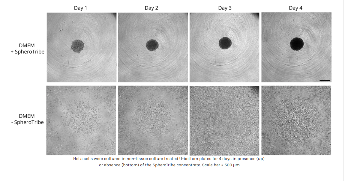 SpheroTribe provides a simple toolkit to generate consistent and robust 3D cell structures (spheroids, organoids) without restriction of cell type. Simply dilute the SpheroTribe solution into your culture medium of choice, watch your cells turn into uniformly sized 3D spheroids and collect them for your downstream assays.