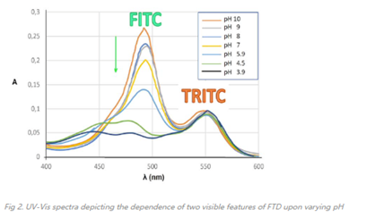 雙重標(biāo)記的特別之處在于,其中FITC熒光(以及吸光度)高度依賴于pH值,而另一個(gè)相應(yīng)的熒光TRIT在pH2 和10之間保持不變(見圖2.)這樣可以準(zhǔn)確測(cè)定活細(xì)胞和組織中的pH值,