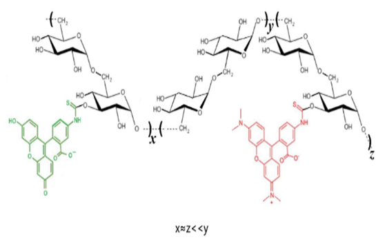 產(chǎn)品結(jié)構(gòu):葡聚糖是由串珠菌B512F菌產(chǎn)生的一類分支多糖。從結(jié)構(gòu)上講,每個(gè)熒光團(tuán)(FITC和TRITC)都通過硫脲乙烷鍵與葡聚糖結(jié)合(圖1)。對(duì)于每種熒光團(tuán),取代度(DS)在每摩爾葡萄糖單元0.001至0.020摩爾染料的范圍內(nèi)。與葡聚糖結(jié)合的FITC/TRITC的摩爾比可以在1:1至2:1之間變化,并在中性pH下進(jìn)行分光光度評(píng)估。產(chǎn)品純化過程(與相應(yīng)的FITC和TRITC葡聚糖非常相似),終產(chǎn)物不含F(xiàn)ITC、 TRIC游離染料(即未結(jié)合的染料或染料副產(chǎn)物)。純化后對(duì)產(chǎn)品的分子量、外觀、溶解度、熒光進(jìn)行檢測(cè),實(shí)際分子量通過GPC法測(cè)定。
